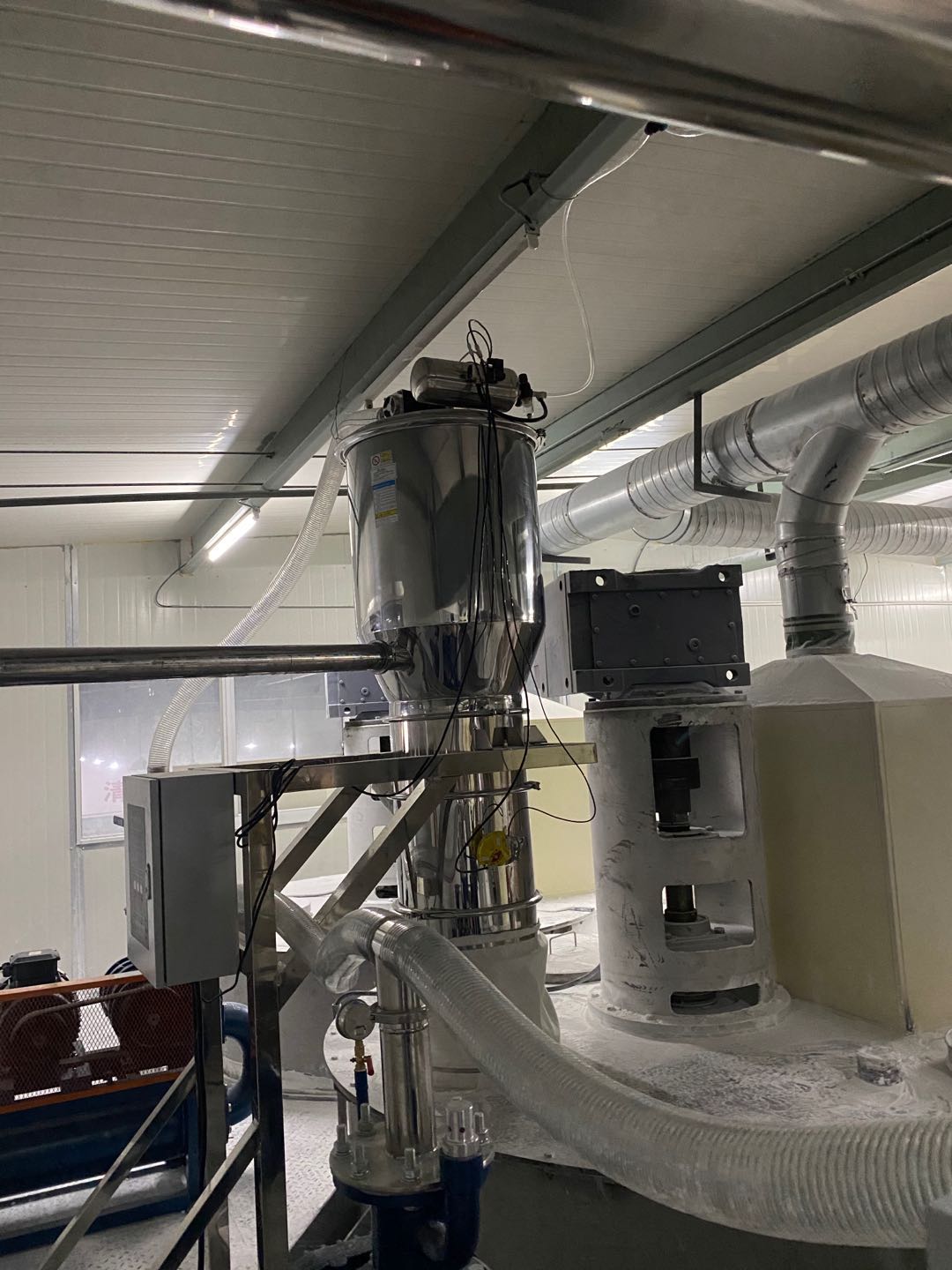 公司給客戶配置RA-DZKS-600型號真空上料機,水平輸送20米 垂直高度7米,實際輸送量每小時達1500KG,完全滿足客戶需求,而且整個輸送投料過程中無粉塵。